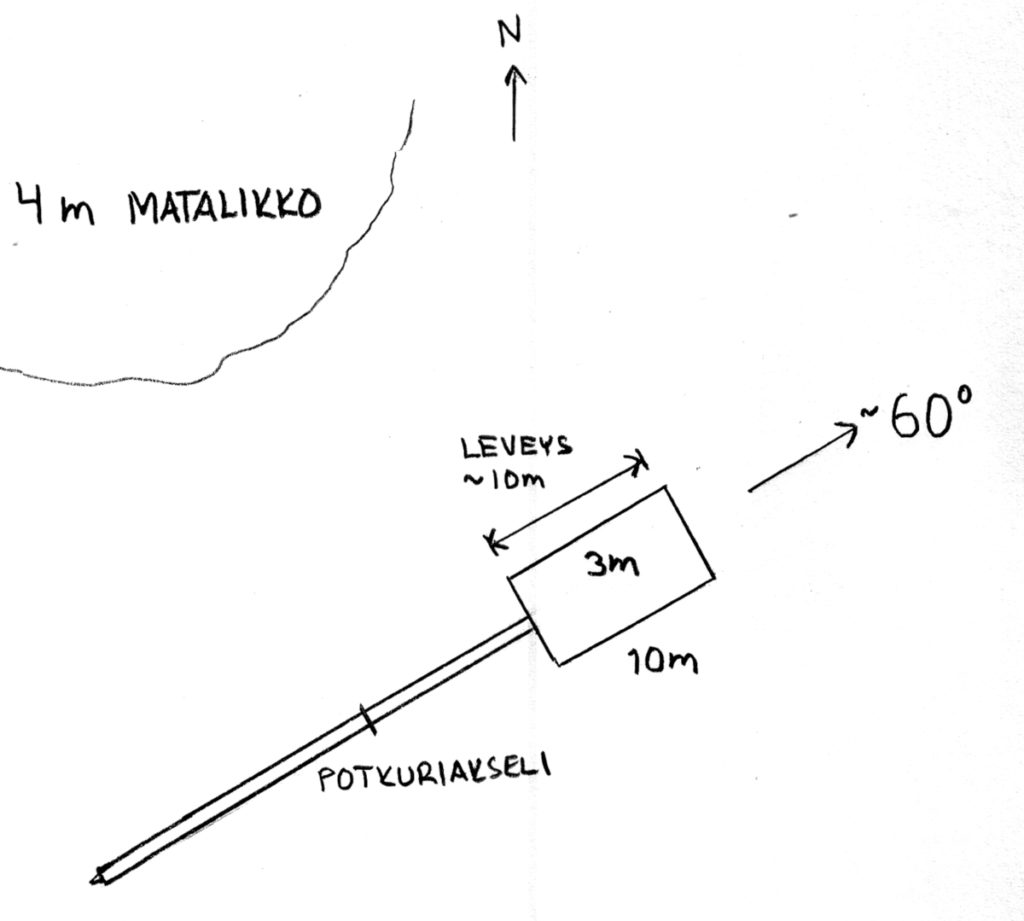 – Ruumaluukun takaosasta kompassisuuntaan 230astetta matalikon reunaa. Matka on noin 0,6 kaapelia eli noin 100 metriä.